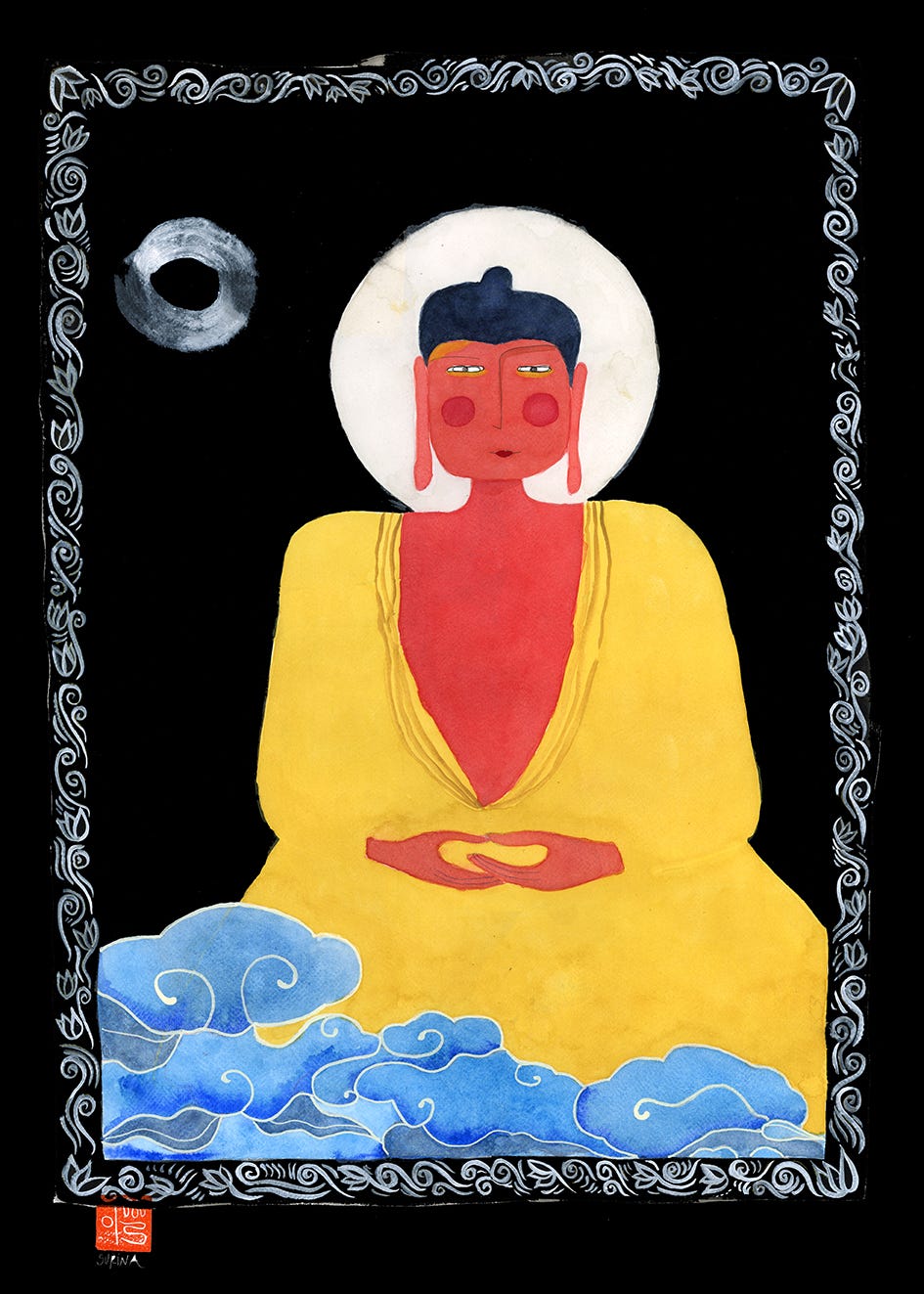 1. Se não fosse no sofá à frente da porta de entrada, só havia dois outros lugares onde você podia encontrá-lo: caminhando em torno da pequena estupa memorial - o monumento sagrado contendo as relíquias de um importante lama da linhagem -, ou limpando o altar, com o avental cor de vinho apertado na barriga redonda e um pano na mão. Eu preferia assisti-lo na segunda tarefa. O homem esvaziava as oferendas de água dentro do balde, depois secava cada potinho como se limpá-los fosse tão natural quanto a própria respiração. Isso sim é mindfulness, eu pensava, não aquele monte de bla bla bla que vendem no ocidente. Ele trocava a água das flores e substituía as murchas, quase sempre crisântemos. Brancos, amarelos, e também os crisântemos artificialmente tingidos de azul-céu, horríveis, que ele tratava com a mesma hierarquia que usava para o resto. Parecia que todos ali mereciam a mesma apreciação. Potes, flores, balde, gente.